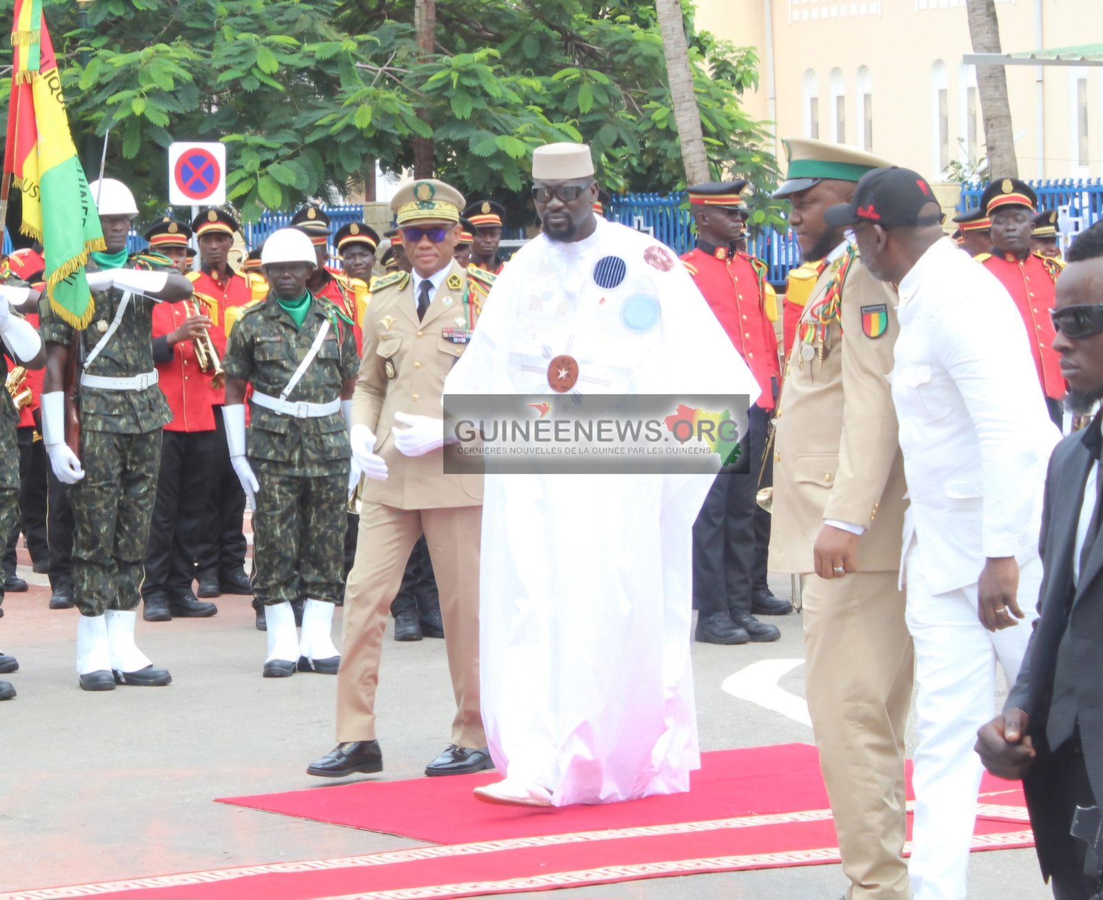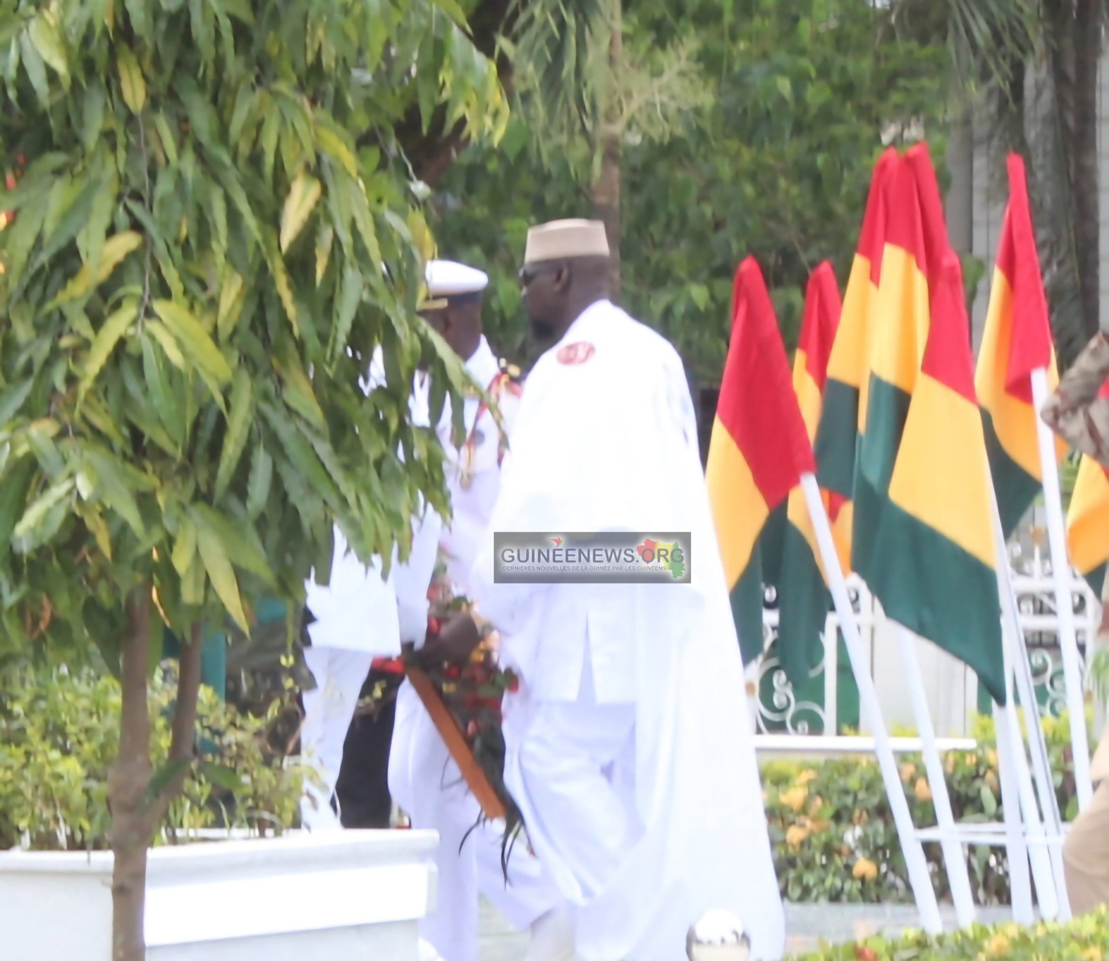 Le Chef de l’État, général Mamadi Doumbouya, est arrivé peu avant 11 heures, vêtu de blanc et à bord d’une Jeep militaire, en compagnie du chef d’état-major général des Armées. Son épouse a également pris part à la cérémonie de recueillement.