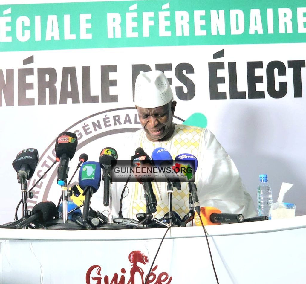 « Nombre de circonscriptions électorales 412, nombre de centres de vote 16 722, nombre de bureaux de vote 23 662, nombre de bureaux pris en charge 22 681 soit 95,69 %. Total inscrit 6 768 458, total votant sur la liste d’émargements 32 423, total votant 5 951 807, taux de participation 86,42 %, total bulletin nul 205 480, suffrage valablement exprimé 5 746 327 soit 96,55 %. Suffrage exprimé pour le Oui, 5 135 951 soit 89,38 %, suffrage exprimé pour le Non 610 376 soit 10,62 % », a déclaré Ibrahima Kalil Condé.