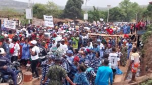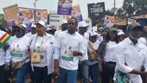 Lors de sa visite, TMB accompagné du Directeur Général Adjoint de l’OGP, de Marie Yvonne Coumbassa a drainé une foule compacte de l’entrée principale de la ville jusqu’au stade Konko Sylla.