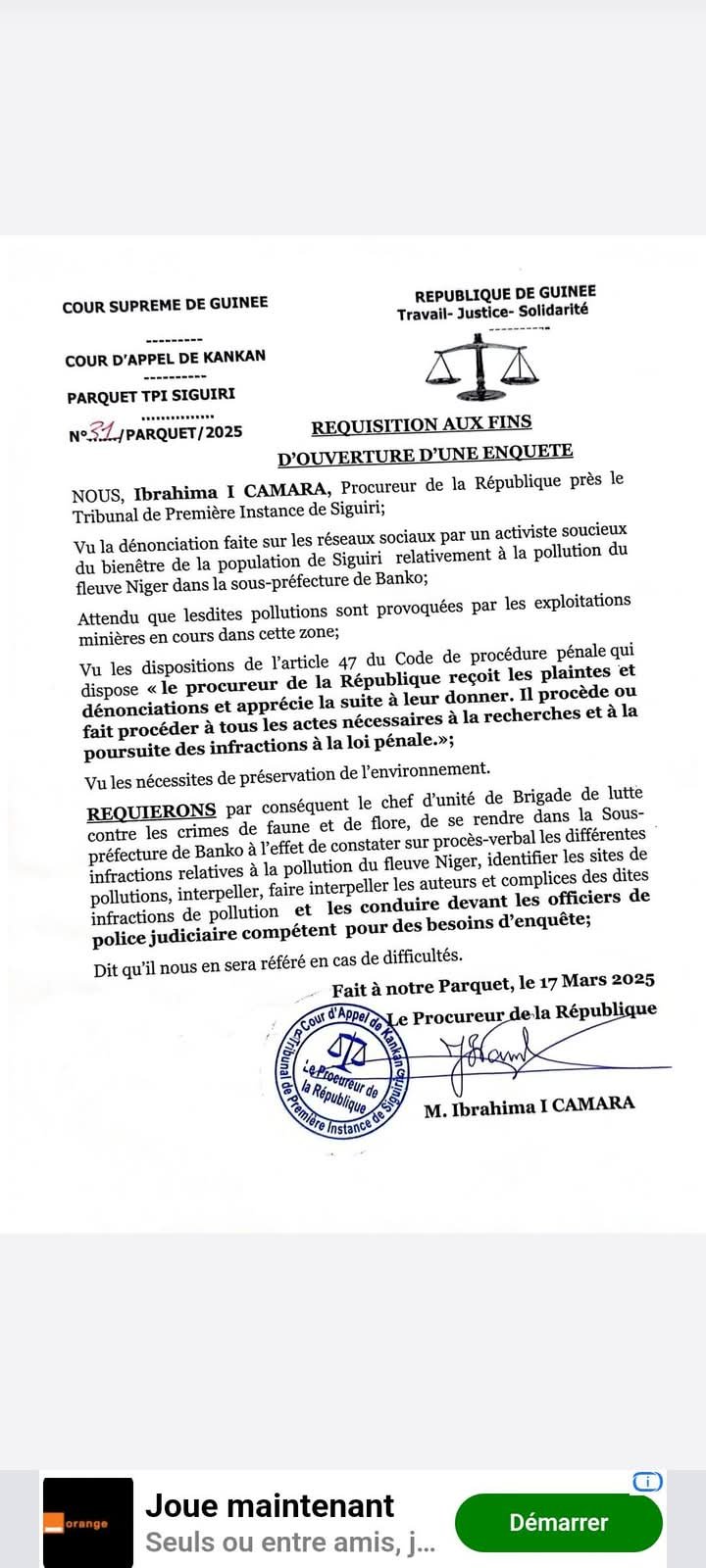 C’est suite à la dénonciation d’un activiste sur les réseaux sociaux pour le bien-être de la population de Siguiri, concernant la pollution du fleuve Niger dans la sous-préfecture de Bankon, que le procureur de la République près le tribunal de première instance de Siguiri, Ibrahima 1 Camara a fait une réquisition aux fins d’ouverture d’une enquête.